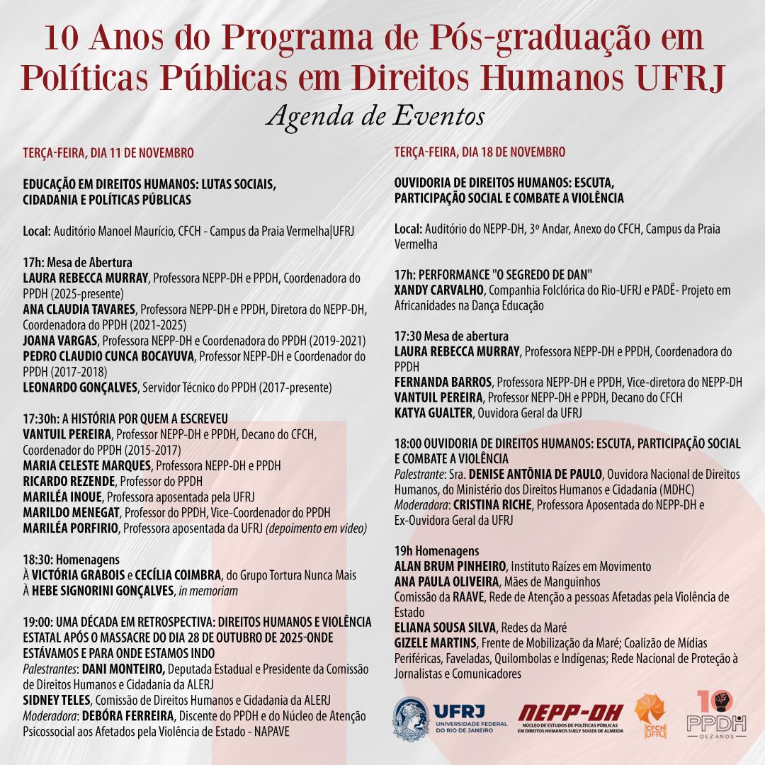 Estão previstas mesas de debates sobre a história do PPDH e diferentes aspectos sobre os Direitos Humanos com a presença de professores e pesquisadores da área, políticos, ativistas, integrantes de movimentos sociais, entre outros. Entre os temas a serem abordados, estará a violência do Estado contra a população negra e os moradores de favelas e periferias, recordando a a chacina que resultou em mais de 100 mortes no Complexo da Penha, em outubro último.
